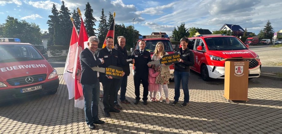 Der Bürgermeister Herr Scharnke, die Fachbereichsleiterin des FB III Frau Kalitzki, die Vorsitzende der Gemeindevertretung Frau Dr. Goetz sowie ihr Stellvertreter Herr Epperlein übergaben im Rahmen einer Feierstunde am Freitag zwei neue Einsatzfahrzeuge an den Gemeindewehrführer Rico Vogel sowie seinen Stellvertreter Tino Zielinski.