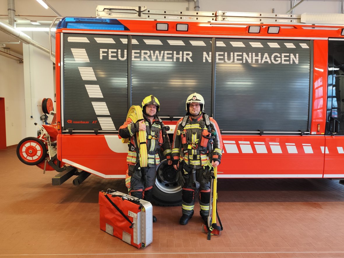 Das Foto zeigt zwei Feuerwehrkameraden mit vollständiger Ausrüstung eines vorgehenden Trupps für die Brandbekämpfung.