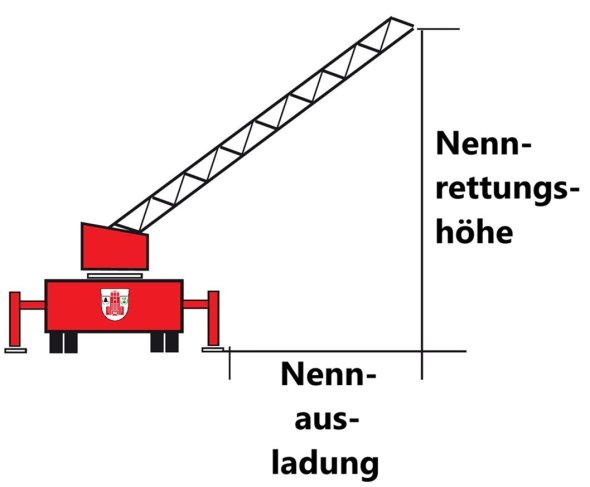 Die Nennreichweite einer Drehleiter setzt sich aus der Nennrettungshöhe und der Nennausladung zusammen.
