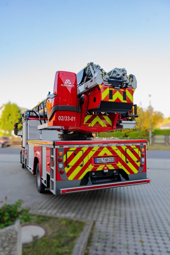 Als weitere Besonderheit ist am Fahrzeug die Sicherheitsfunktion Magirus SkyBeam verbaut. LED-Scheinwerfer an der Leiterspitze und dem Rettungskorb sind in Start- oder Nullstellung des Fahrzeugs nach oben ausgerichtet.